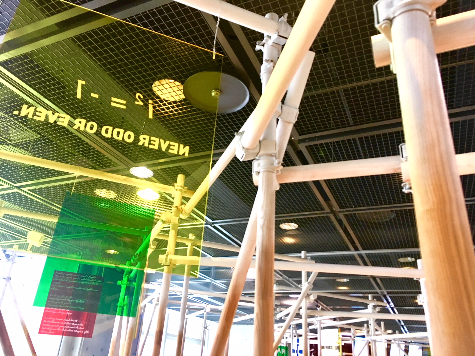 ところどころにカラフルなプレートが下げられていて、斜めに計算されて設置された席はお客さんどうし目が合わない仕組み。