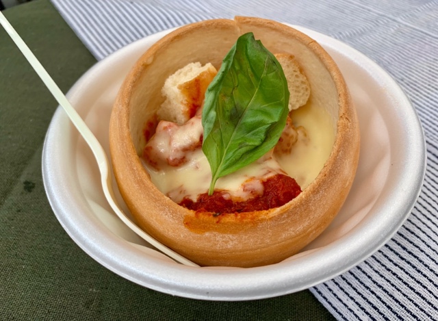 唐揚げにトマトソース、そしてたっぷりのチーズがパンのポットに収まってます。