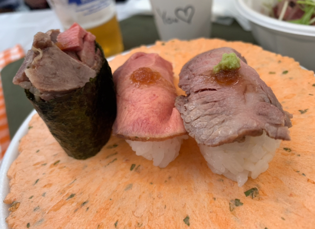 タン・ユッケ・肩ロースがたこせんにのったこの肉寿司。赤みの残ったお肉の絵力はんぱないです!