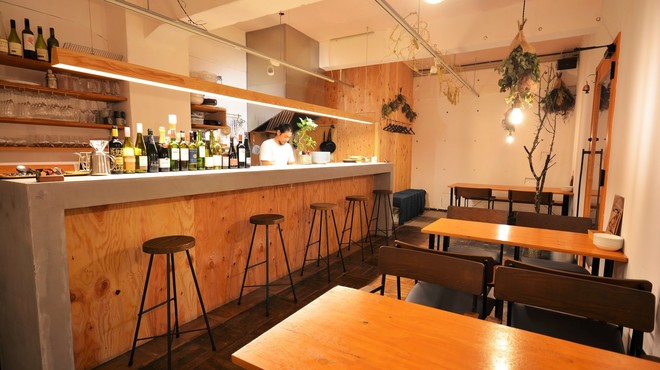 店内はコンクリート打ちっ放し&木の温もりが調和した、インダストリアルな雰囲気。