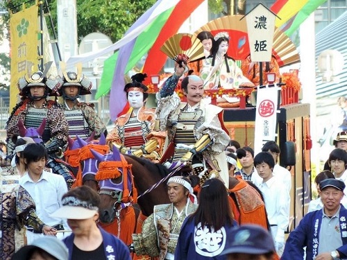 織田信長・豊臣秀吉・徳川家康の三英傑が約600人を従えて行進する