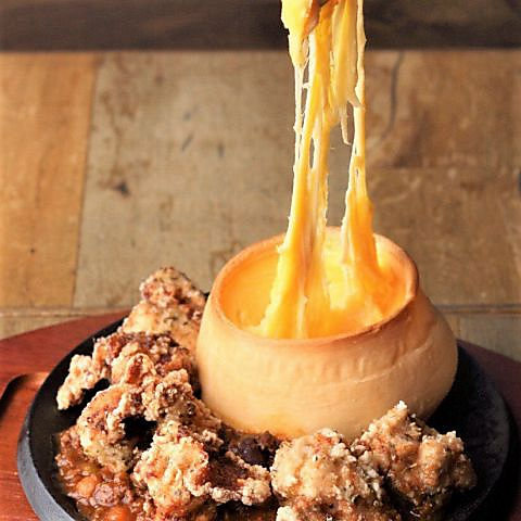 たっぷりの特製チリビーンズとフライドチキンをトッピング、熱々とろーりチーズをバケットと共に