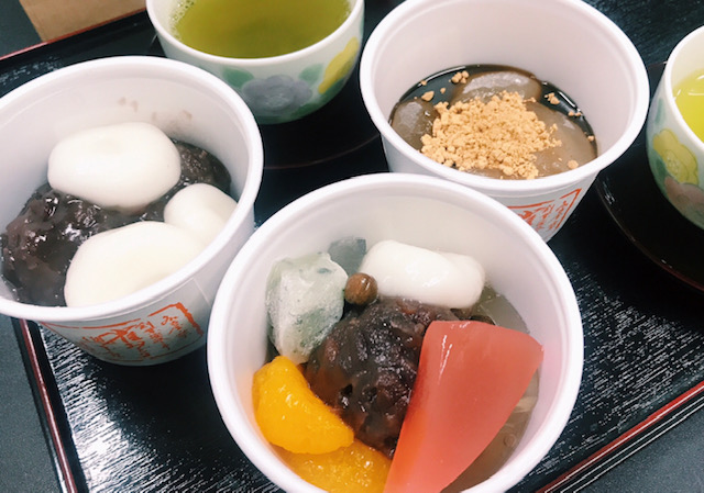 手前からあんみつ(¥450)、右奥わらびもち(¥500)、左奥が白玉ぜんざい(¥450)。