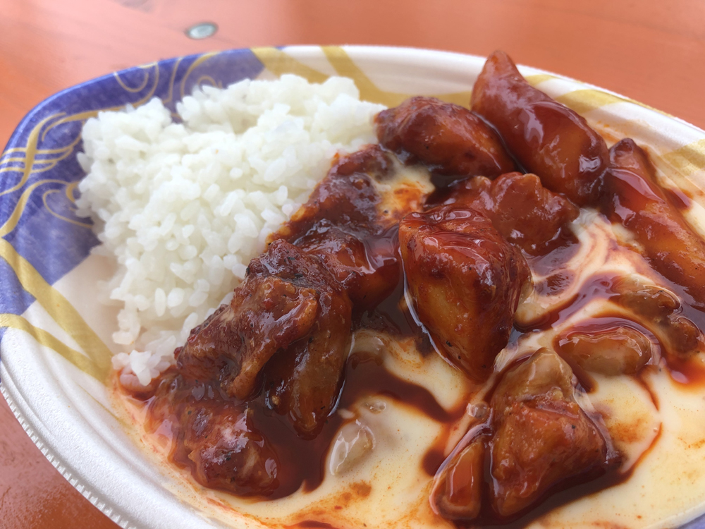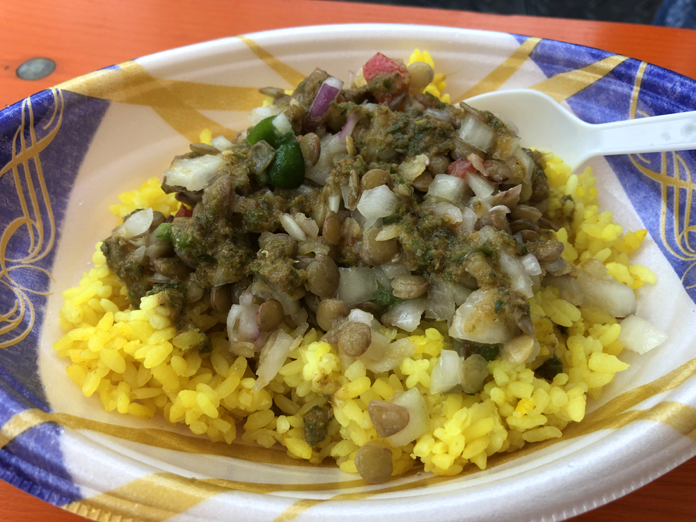 屋台の中の、優しいアフリカーンなおじ様も、「辛いよぉ〜♪」っと、にこやかに微笑みながら、なんか緑色の液体を、サービスでいっぱいかけてくれます。「も、も、も、もう大丈夫です!!!それ以上は勘弁してください!!!」と奪うように受け取ると、やさしい二人にお礼を言って席へ。