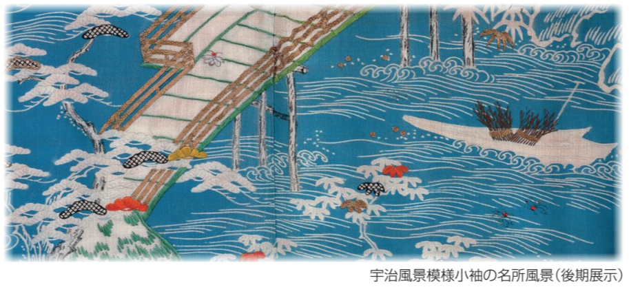 いわゆる、江戸時代の小粋なオシャレアイテムだった小袖の企画展・・・といいたいところですが、その当時は写真も印刷技術もない中で、いかに、この名所風景を描くかという技術の結晶といえる作品。友禅染の技法、糸目糊・色挿しなどを駆使して描かれた名所風景は、現代人の目にも美しくも艶やかに見えるはずです。