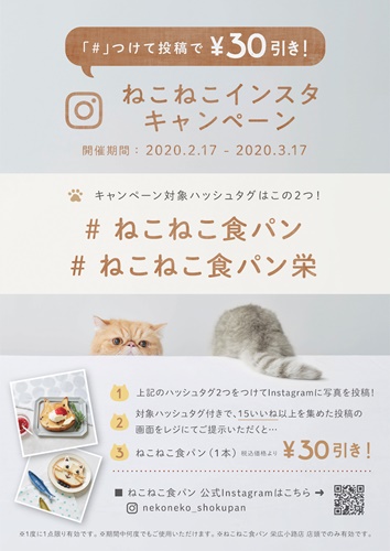 ご自身のインスタグラムに下記の2つのハッシュタグを付けて「ねこねこ食パン」を投稿していただき、「♥15いいね」をゲットすると、ねこねこ食パン1斤が30円引き!