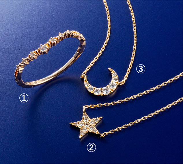 緩やかなV字が夜空にかかる天の川をイメージしたリング、希望や運命を表す月や星モチーフのネックレスなど、贅沢なダイヤモンド使いが魅力の大人のスターモチーフジュエリーです。(1階 アガット)