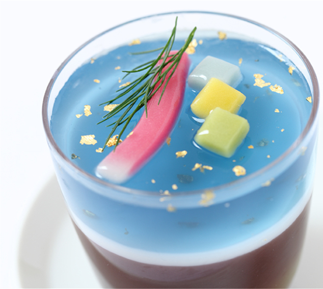 マスカットを忍ばせた生水羊羹の上に、ブルーの寒天と金箔で天の川を描きました。(地下1階 菓匠 花桔梗)