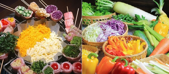 写真右)野菜巻き串フォンデュセット(サラダバー付)