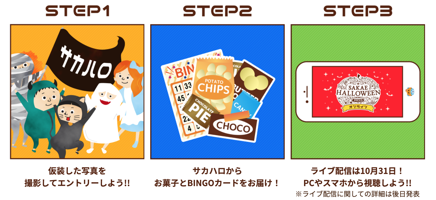 しかも、先着1,000名の参加者(仮装写真応募者)にはお菓子とサカハロビンゴカードなどをご自宅にお送りします。