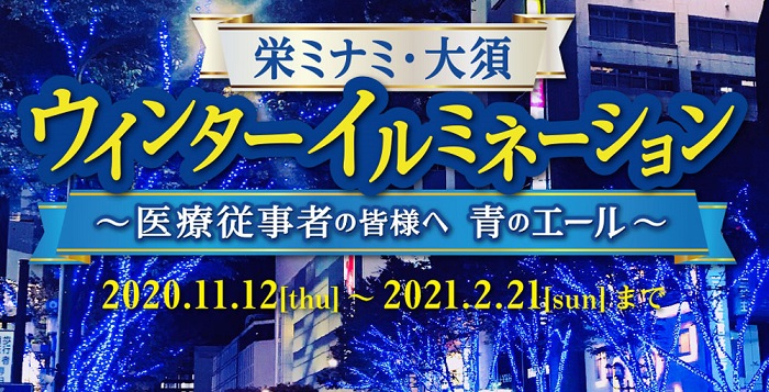 いよいよ本日17時より「栄ミナミ・大須ウインターイルミネーション」がスタートします。今年は、<医療従事者の皆さまへ 青のエールとして>として、