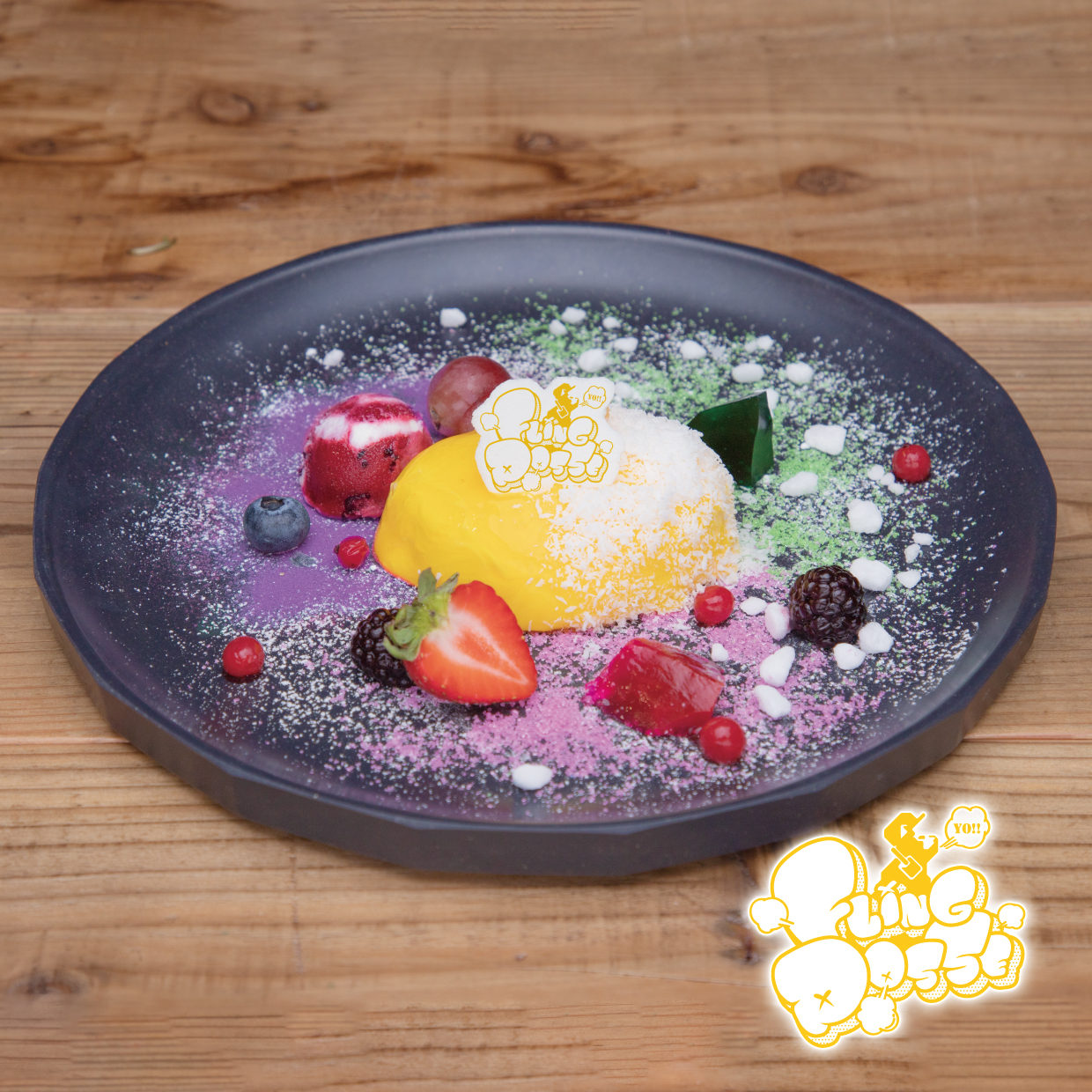 名古屋GUEST会場 メニュー提供期間 ≫ 12/29(火)~ 1/24(日) 3人のイメージカラーの中央に黄色にかがやくマンゴー味のムースと、 カラフルなゼリーのデザートプレート。