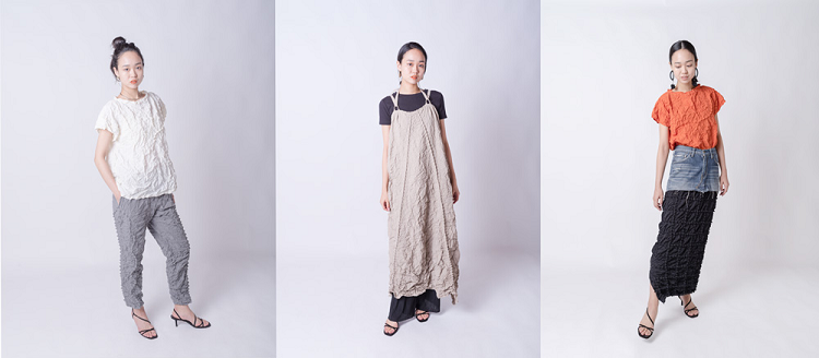 今期は絞りの中でも、ヒートセット加工を活かしたクラッシュ加工の質感とナチュラルカラーが新しいアイテムを展開しています。