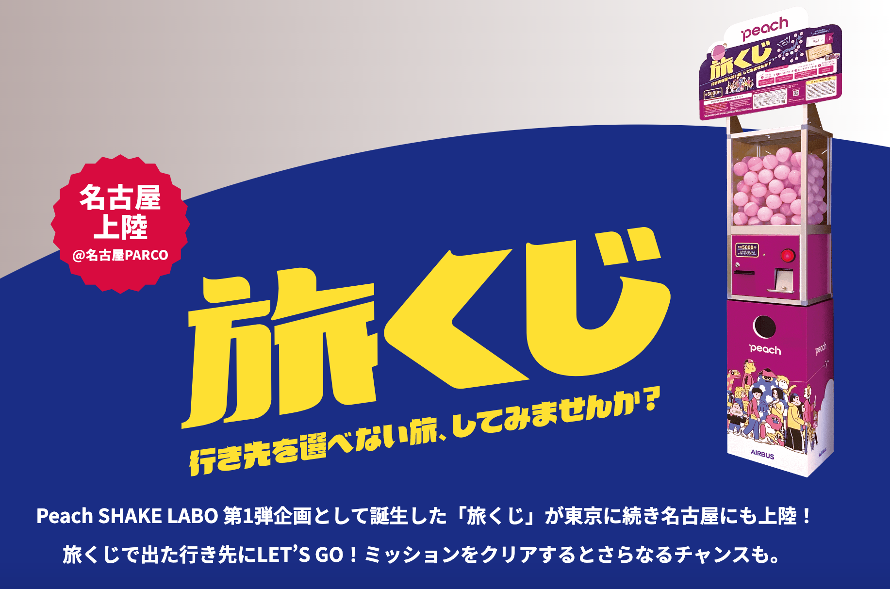 東京・大阪で導入されて売り切れ完売となった、話題のPeach「旅くじ」が名古屋パルコに新登場!!新しい”旅”のスタイルに、あなたも挑戦してみませんか?