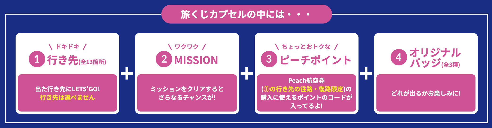 各カプセルの中には、指定された行き先、旅のミッション、Peach の航空券(行き先限定)が購入できるピーチポイント、オリジナル缶バッジが封入されています。