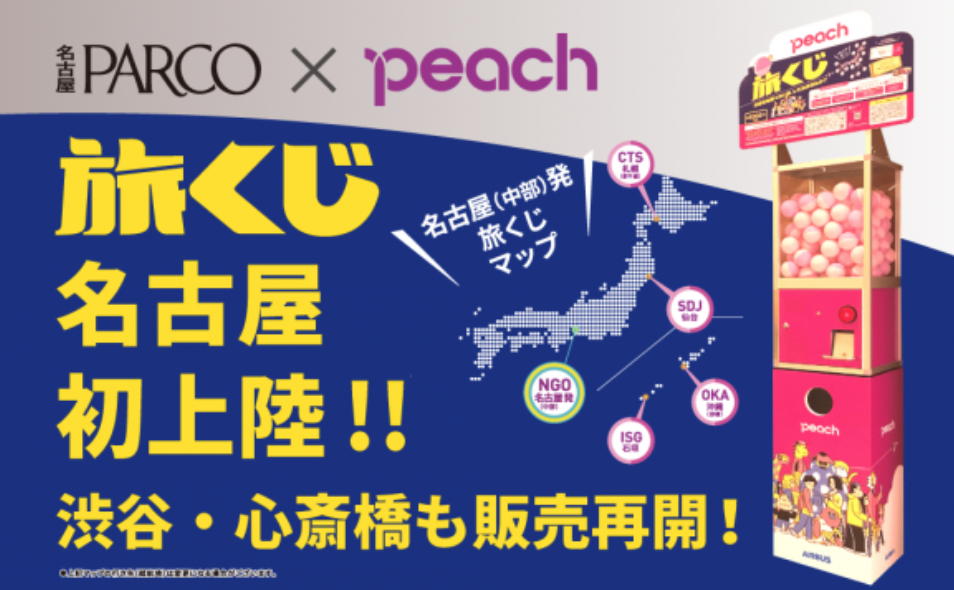 東京・大阪で導入されて売り切れ完売となった、話題のPeach「旅くじ」が名古屋パルコに新登場!!新しい”旅”のスタイルに、あなたも挑戦してみませんか?