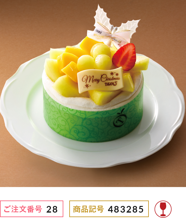 老舗フルーツ専門店が作ったクリスマスケーキ。スポンジ、ホワイトチョコムース、マンゴーのシラップ漬け、メロンムースを層にしてメロン風味のスポンジで巻いた一品です。