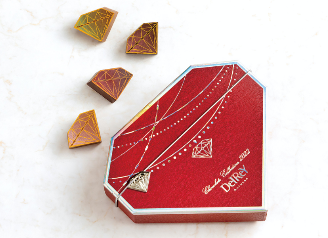 キャラメルやピスタチオなどのフレーバーが楽しめる6種のダイヤモンド型ショコラを、ジュエリーの輝きをまとったレッドカラーのダイヤモンドボックスに。