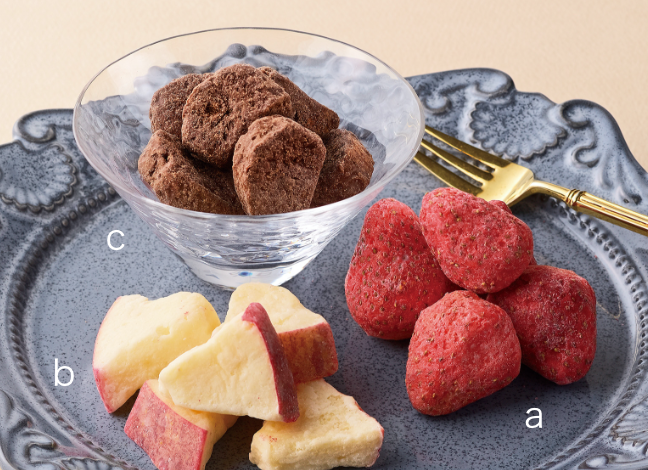 a.チョコいちご (100g)税込1,080円 b.チョコりんご (90g)税込1,080円 c.チョコばなな (90g)税込1,080円
