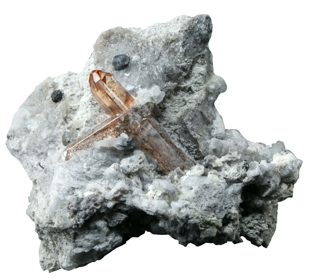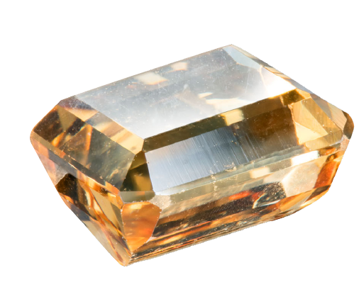 インペリアル・トパーズ(左)ラフ 国立科学博物館所蔵、(右)ルース 日本彩珠宝石研究所所蔵 ※ラフ:原石、ルース:研磨されカットを施されたがまだ枠や台についていない宝石