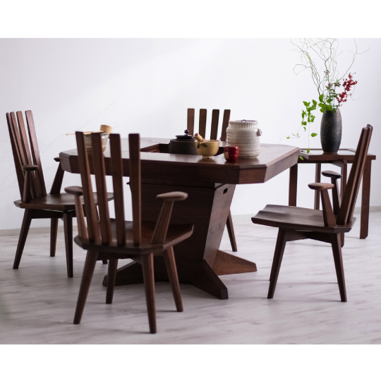 世界三大銘木の一つ「ウォールナット材」を使用し、民芸箪笥の製作技術を駆使して作った和風モダンのダイニングセットです。