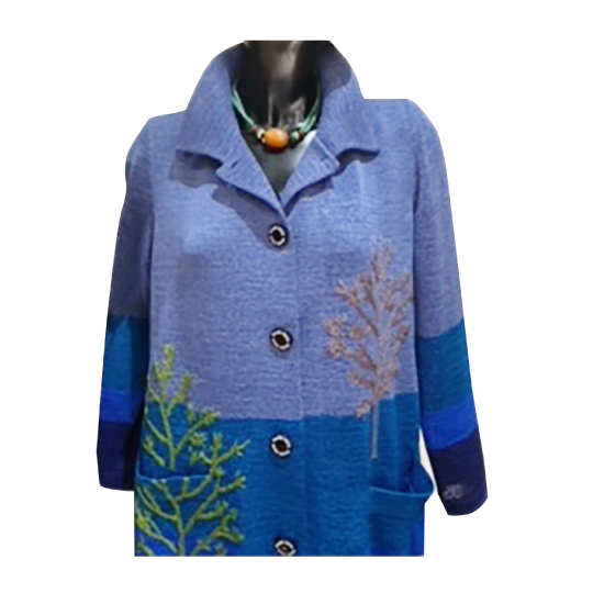 湖面に佇む木を表現し、ひと針ずつ刺繍したロングジャケットです。