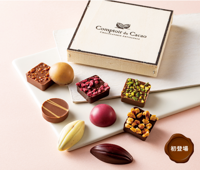 フランスに3店舗を構える家族経営のメゾンのアソート。カカオバターチョコレートの伝統を忠実に守りながら生み出された個性豊かなフレーバーが秀逸。スクエア・ドーム・カカオポッド・ラウンド型と、形も色もさまざまな美しいプラリネを木箱に。