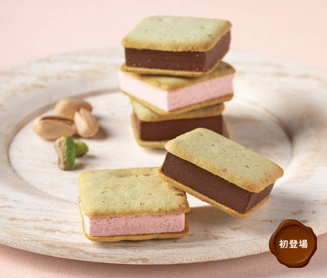 細かく刻んだピスタチオとピスタチオペーストをあわせて焼きあげたラングドシャに、ミルクチョコレートとあまおう苺のチョコレートをそれぞれサンドしました。