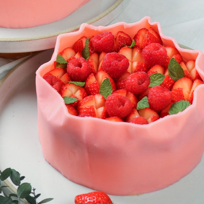 たっぷりのいちごを束ねたフルーツブーケ。中には甘酸っぱいジュレを閉じ込めました。