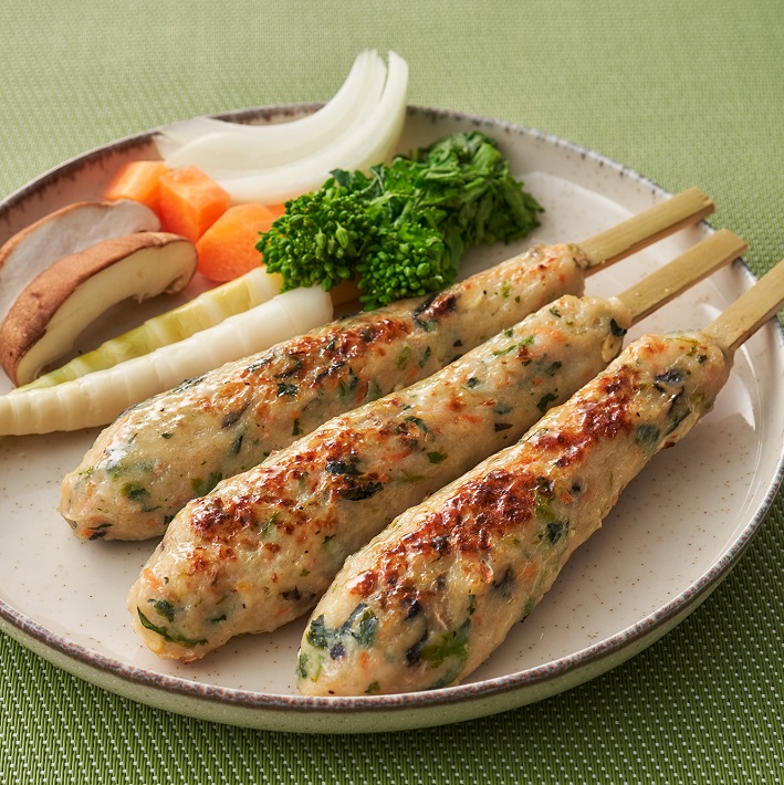 菜の花・筍・椎茸・人参・玉ねぎの五目野菜を入れたジューシーなつくね串です。