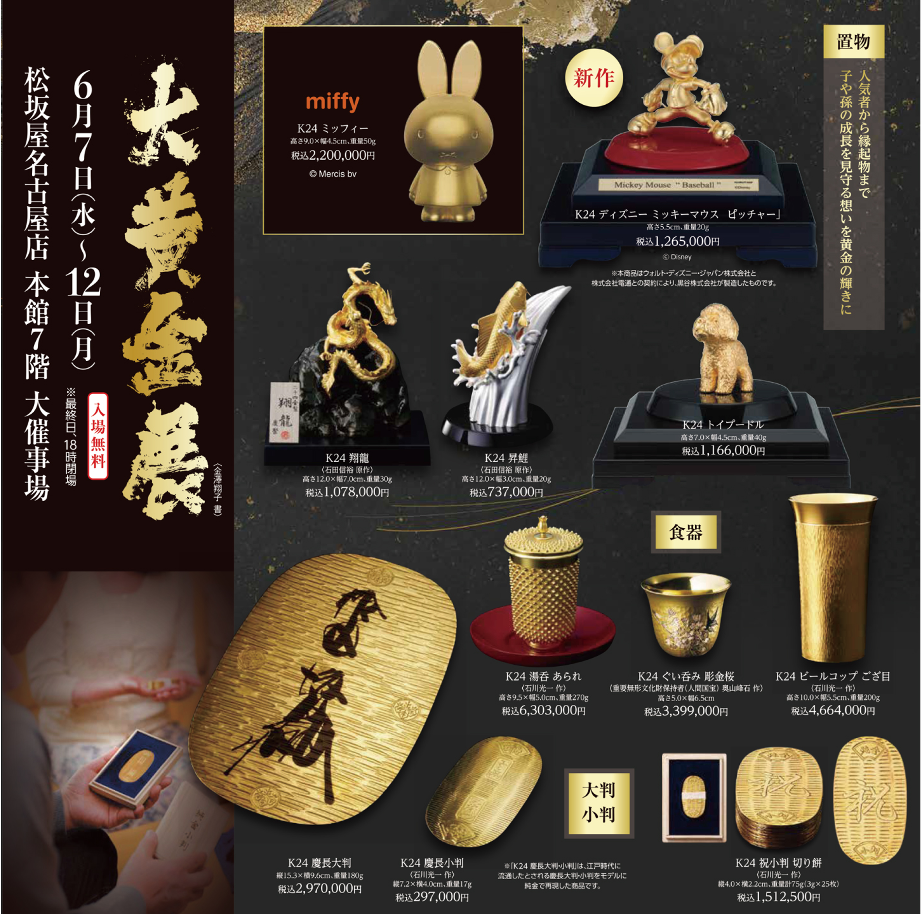 6月7日(水)〜12日(月)の6日間、松坂屋名古屋店・本館7階大催事場で「大黄金展」が開催中です。