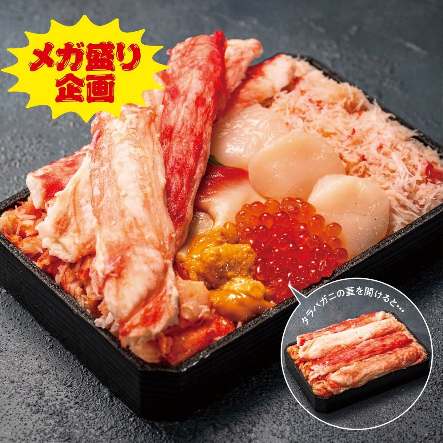 タラバガニの下にかに、ほたて、いくら、うになどの海鮮がぎっしりと詰まった豪華なお弁当です。