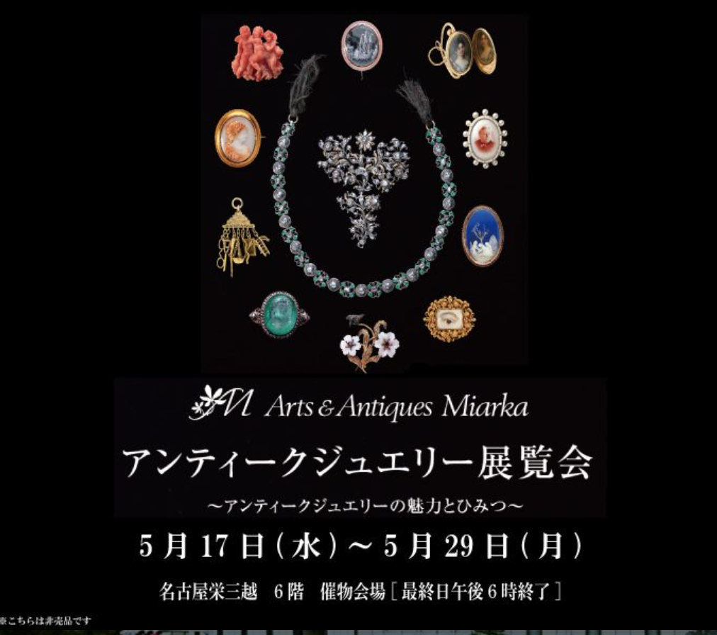 アンティーク専門店 <アーツ&アンティークス ミアルカ>が収集した約400点のジュエリーからなる展覧会が、名古屋栄三越で開催中です。