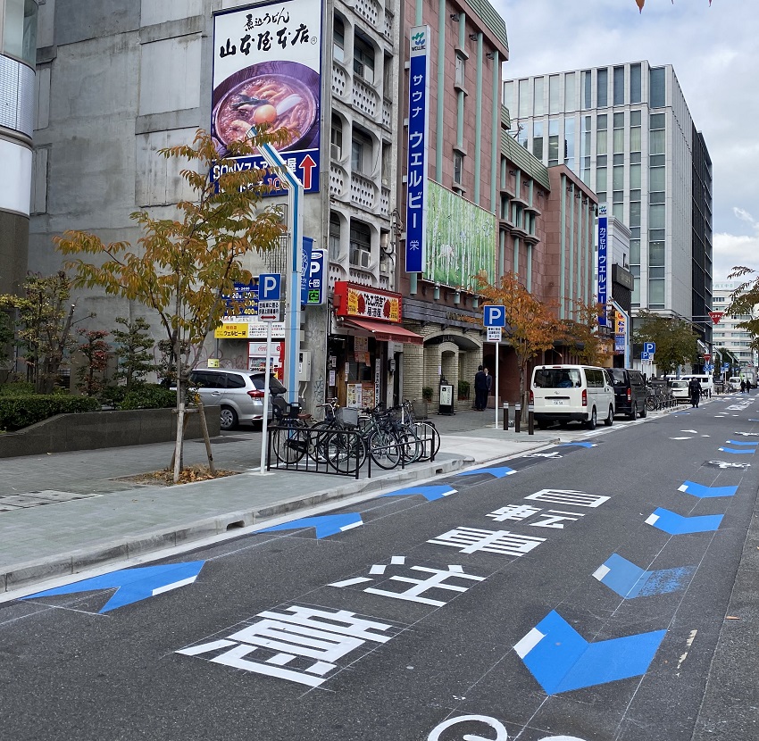 栄ミナミ・大津通の1本西側の南伊勢町通の歩道が広がり、自転車の駐輪スペースも拡大しました。