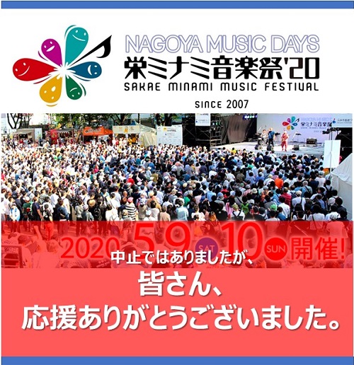 5/9(土)5/10(日)開催する予定でした「栄ミナミ音楽祭'20」を中止させていだたきましたが、アーティストの皆さんのSNSでコメントなど沢山いただきありがとうございました。