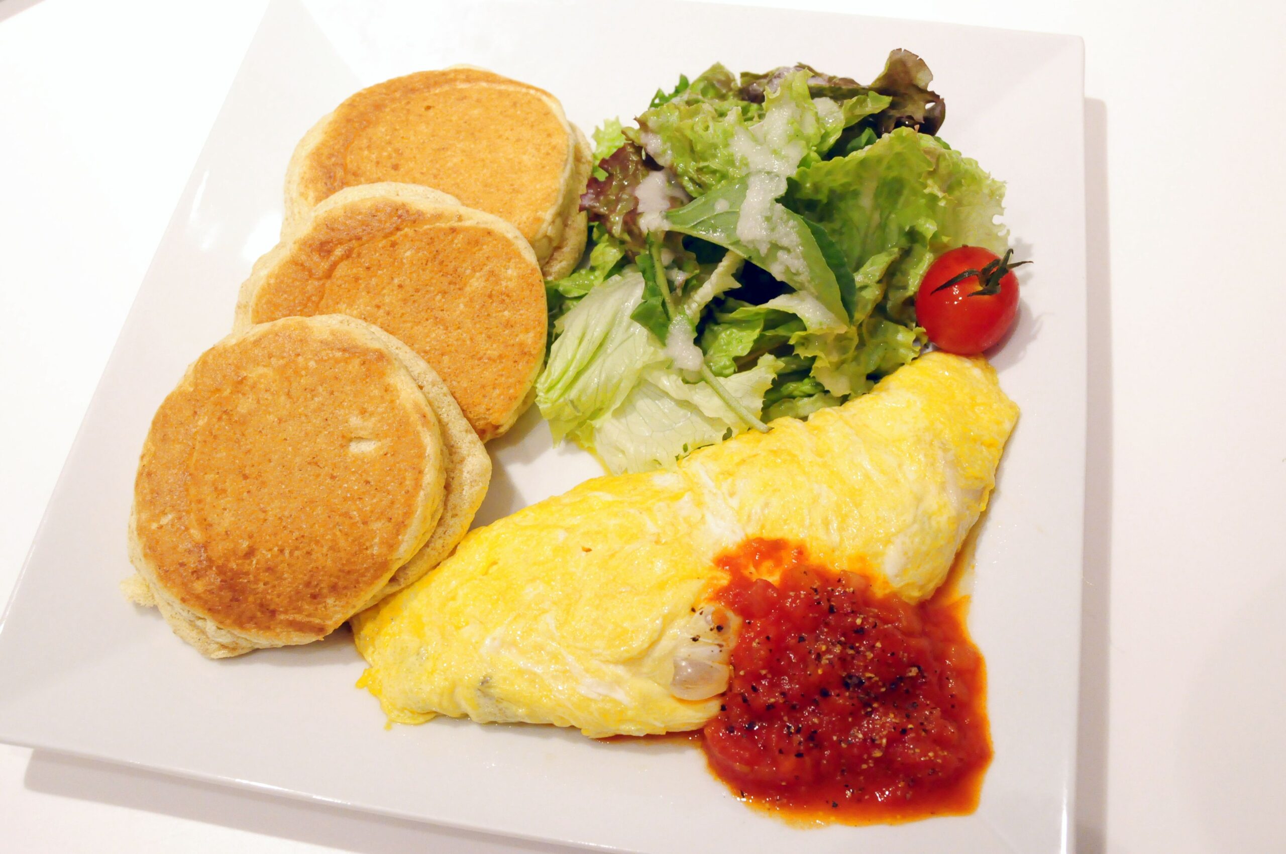パンケーキ生地のたまごの香りと風味を邪魔しないほどよい甘さがうれしいメニューです。