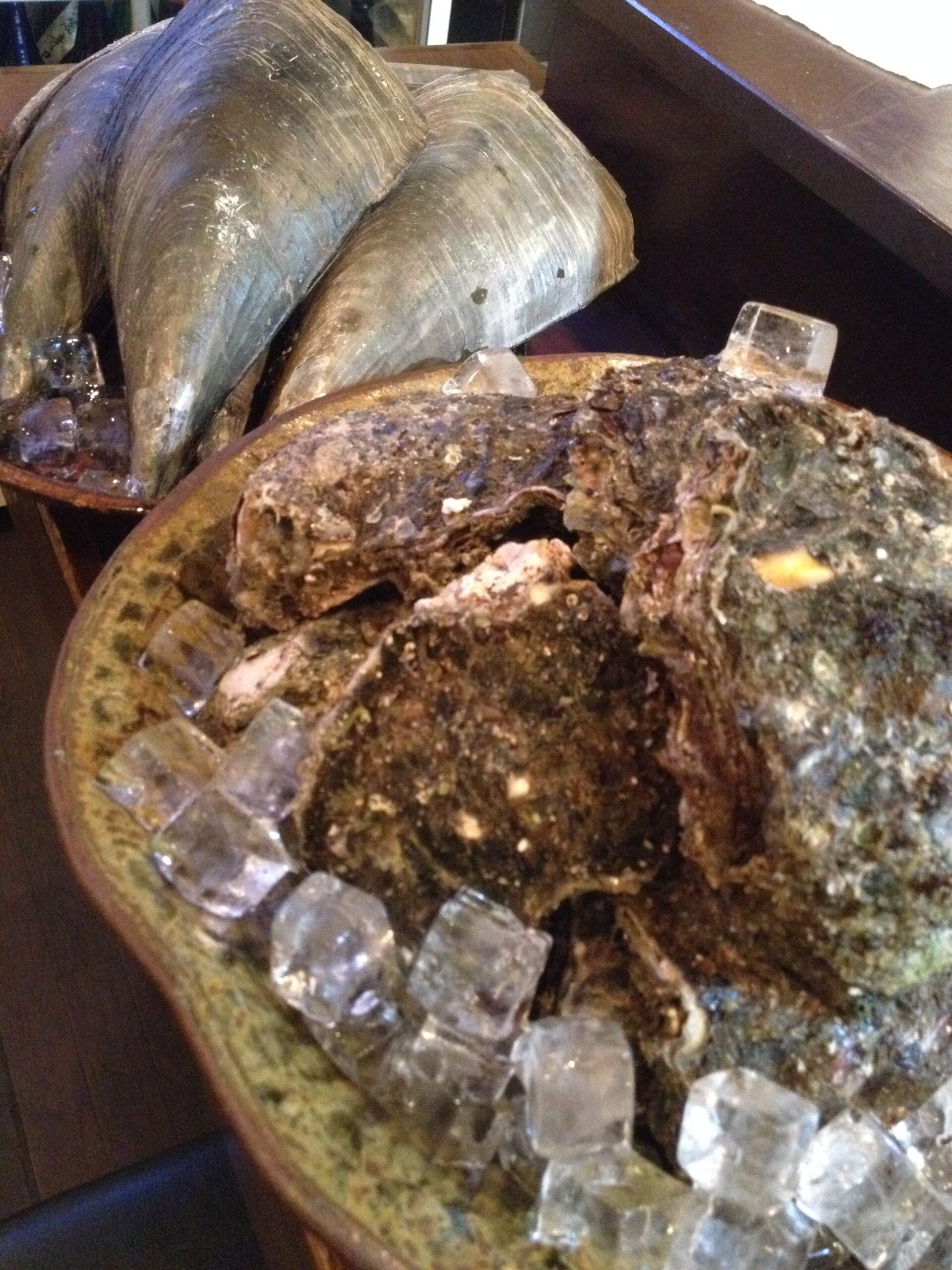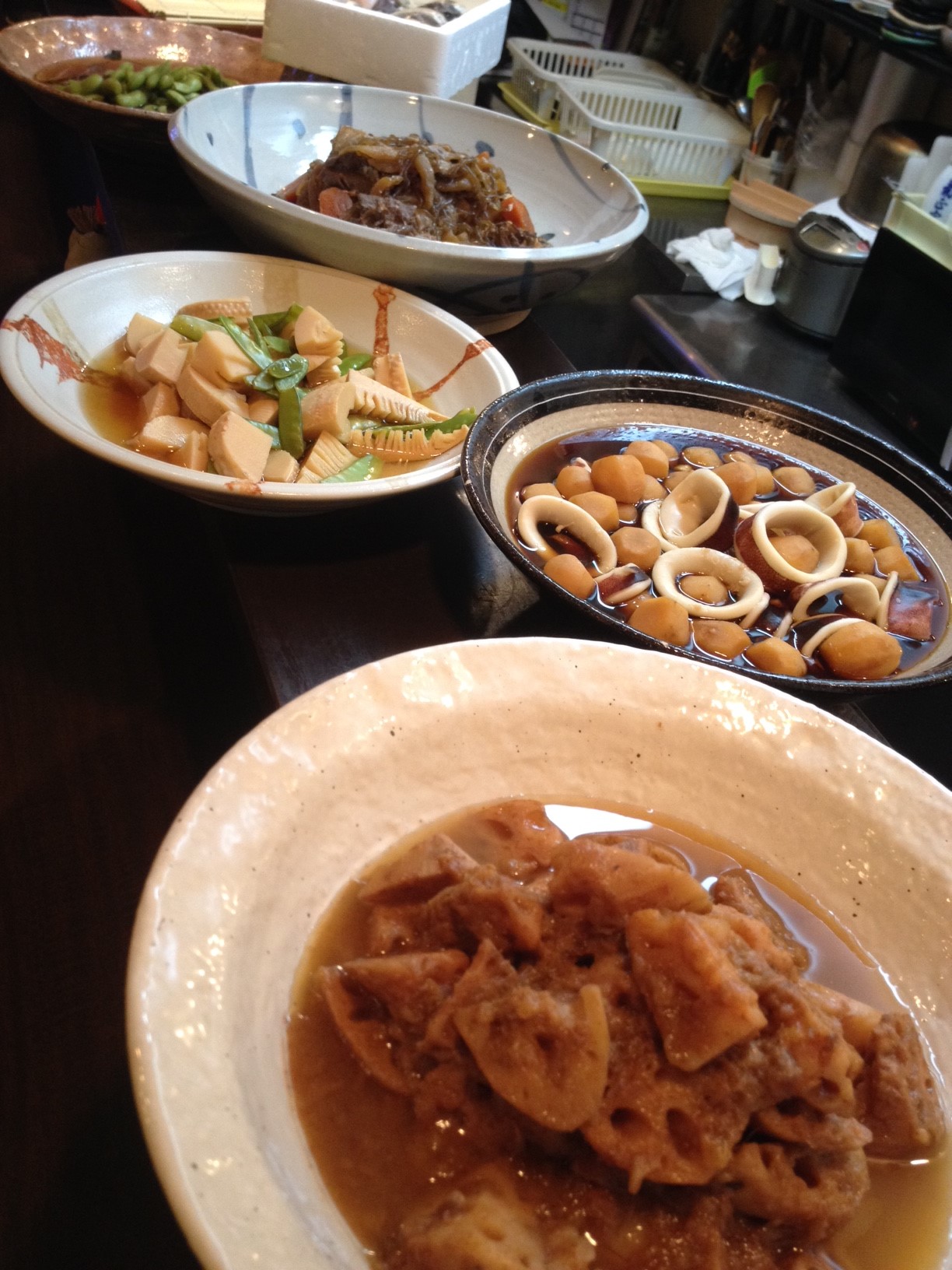 カウンターに並んだ大皿でおばんさい。四季によって変わります。